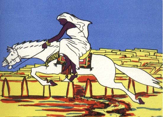 La nuit même, la vaillante Djégué s'échappe du palais aux sept enceintes. Elle échappe aux chiens terribles. Elle saute sur un cheval impatient et, dans l'obscurité, harcelant sa monture, elle galope vers son frère.