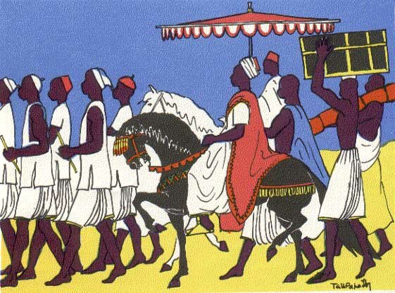Kango Moussa, maître absolu, entouré de ses dignitaires, vit au milieu d'une cour fastueuse, où tout est réglé par un protocole minutieux : cc L'empereur siège sur un grand banc de bois noir, couvert de soie, flanqué de défenses d'éléphant. A ses côtés sont ses armes, sabre, lance, carquois, arcs et flèches, le tout en or. Il est coiffé d'un turban d'étoffes d'or, et vêtu d'une blouse écarlate avec un pantalon fait de vingt morceaux.